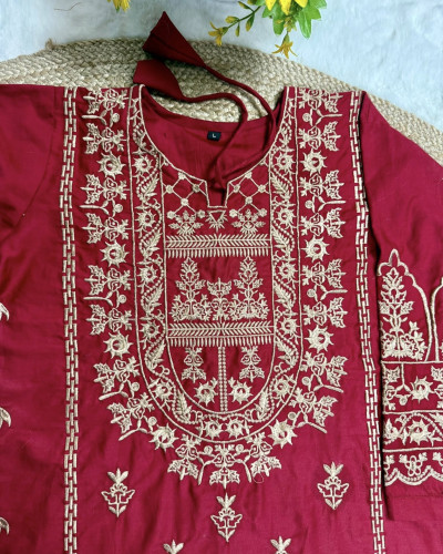 রুচিশীল ও এলিগ্যান্ট লুকের জন্য বেছে নিন এই মেরুন এমব্রয়ডারি টু-পিস সেট। সমৃদ্ধ নকশার সূক্ষ্ম এমব্রয়ডারি কাজ এবং ক্লাসিক কালার কম্বিনেশন আপনাকে দেবে পরিপাটি ও আভিজাত্যের ছোঁয়া। দৈনন্দিন ব্যবহার থেকে শুরু করে পারিবারিক অনুষ্ঠান—সব ক্ষেত্রেই মানানসই।